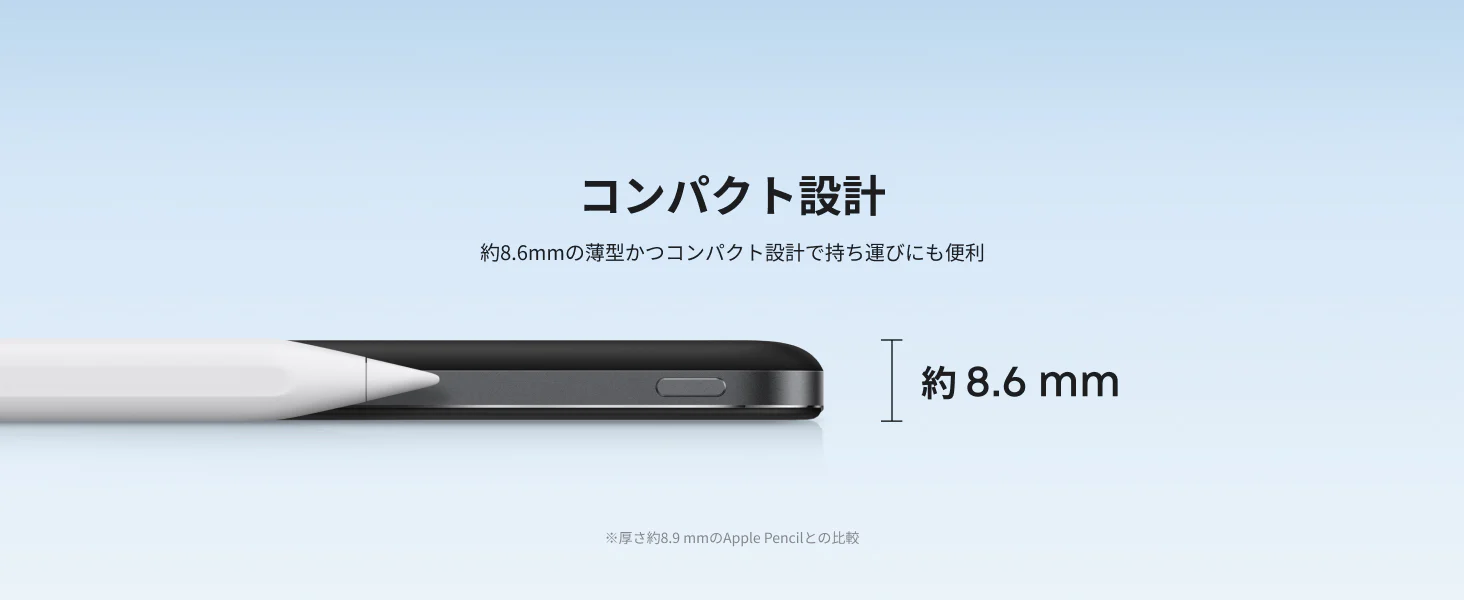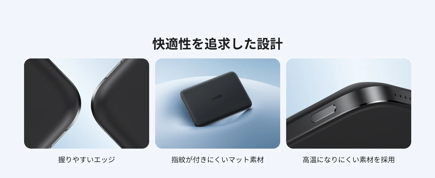 2025年7月17日時点で、Anker史上最薄となる厚さ約8.6mmで、ポケットや小さなカバンにも入れやすいサイズ感です。